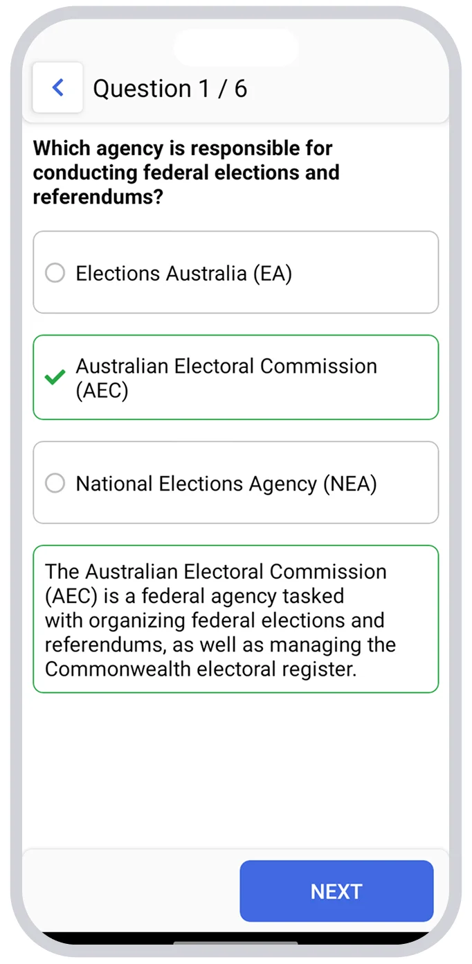 Based on "Australian Citizenship: Our Common Bond", Application helps you prepare for the citizenship test. Also allows you to select an exam simulation an unlimited number of times. You can also study for each section, highlighting important information. Each question in the test has an explanation which allows you to learn from your mistakes.
